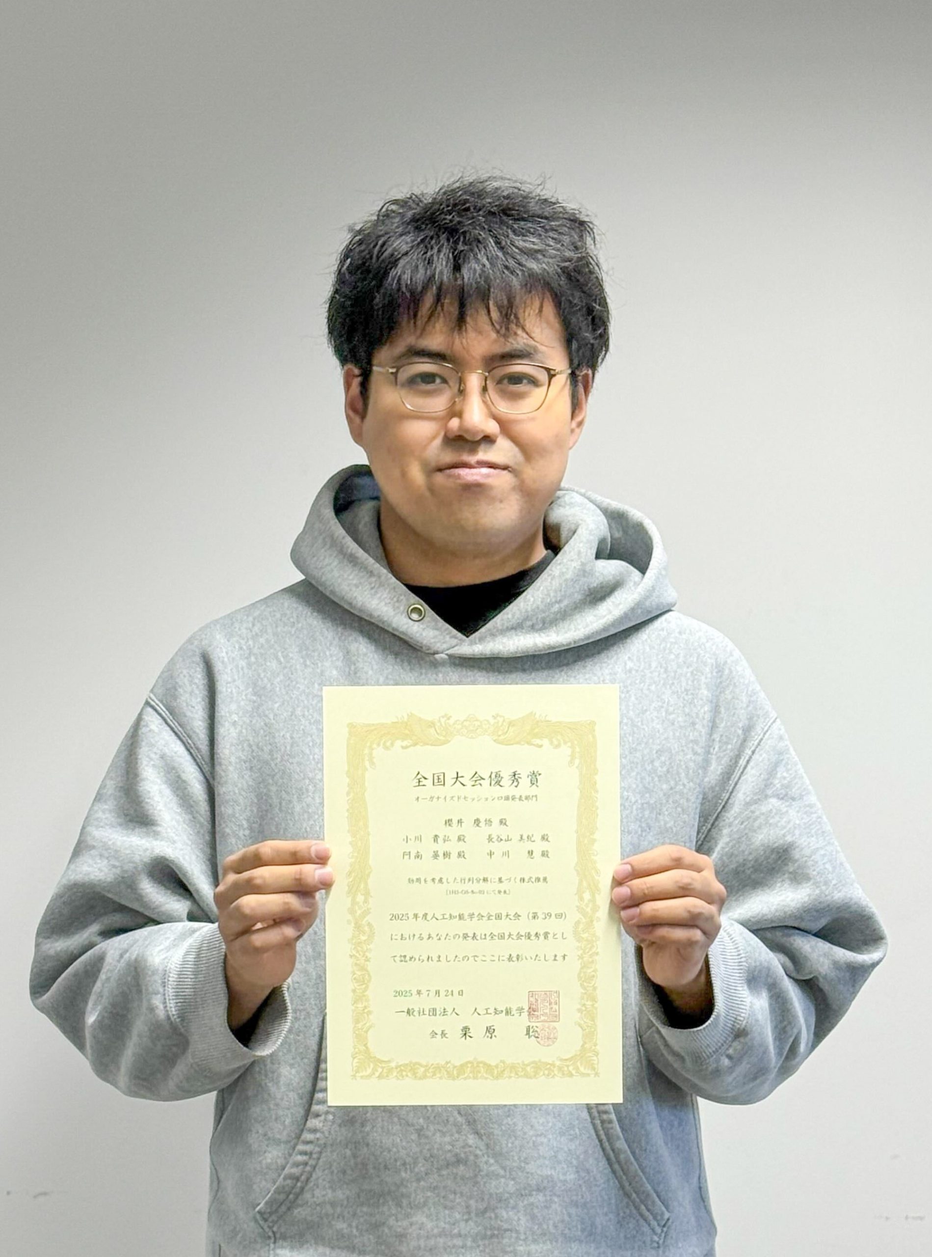 当拠点の櫻井慶悟特任助教の論文が、2025年5月27日(火)~5月30日(金)に大阪国際会議場で開催された2025年度人工知能学会全国大会(JSAI2025)において、2025年度全国大会優秀賞(オーガナイズドセッション口頭発表部門)を受賞しました。また、人工知能学会誌2025年11月号に受賞者一覧が掲載されました。