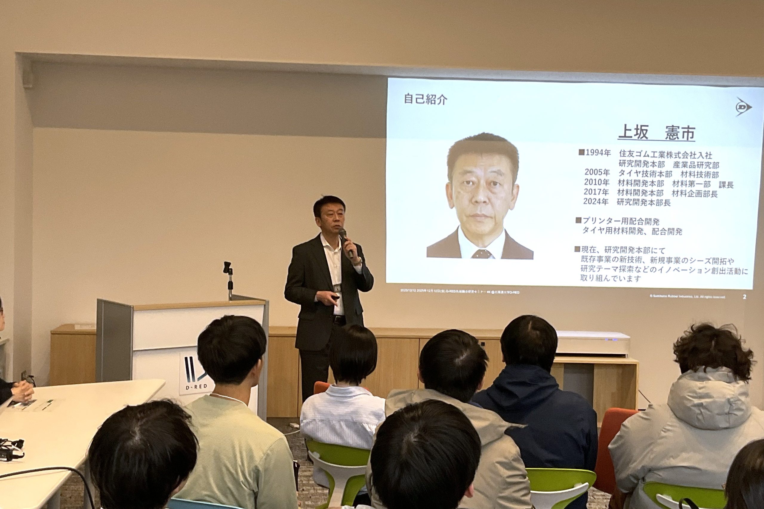 データ駆動型融合研究創発拠点(D-RED)では、多様な融合研究分野とデータ駆動型サイエンスを組み合わせた先端融合研究に関する知見を、優れた若手研究者や大学院生等と共有することを目的とし、12月12日に<第4回D-RED先端融合研究セミナー>「住友ゴム工業イブニングセミナー~D-REDから始まる「はずむ未来へ」~」を開催しました。